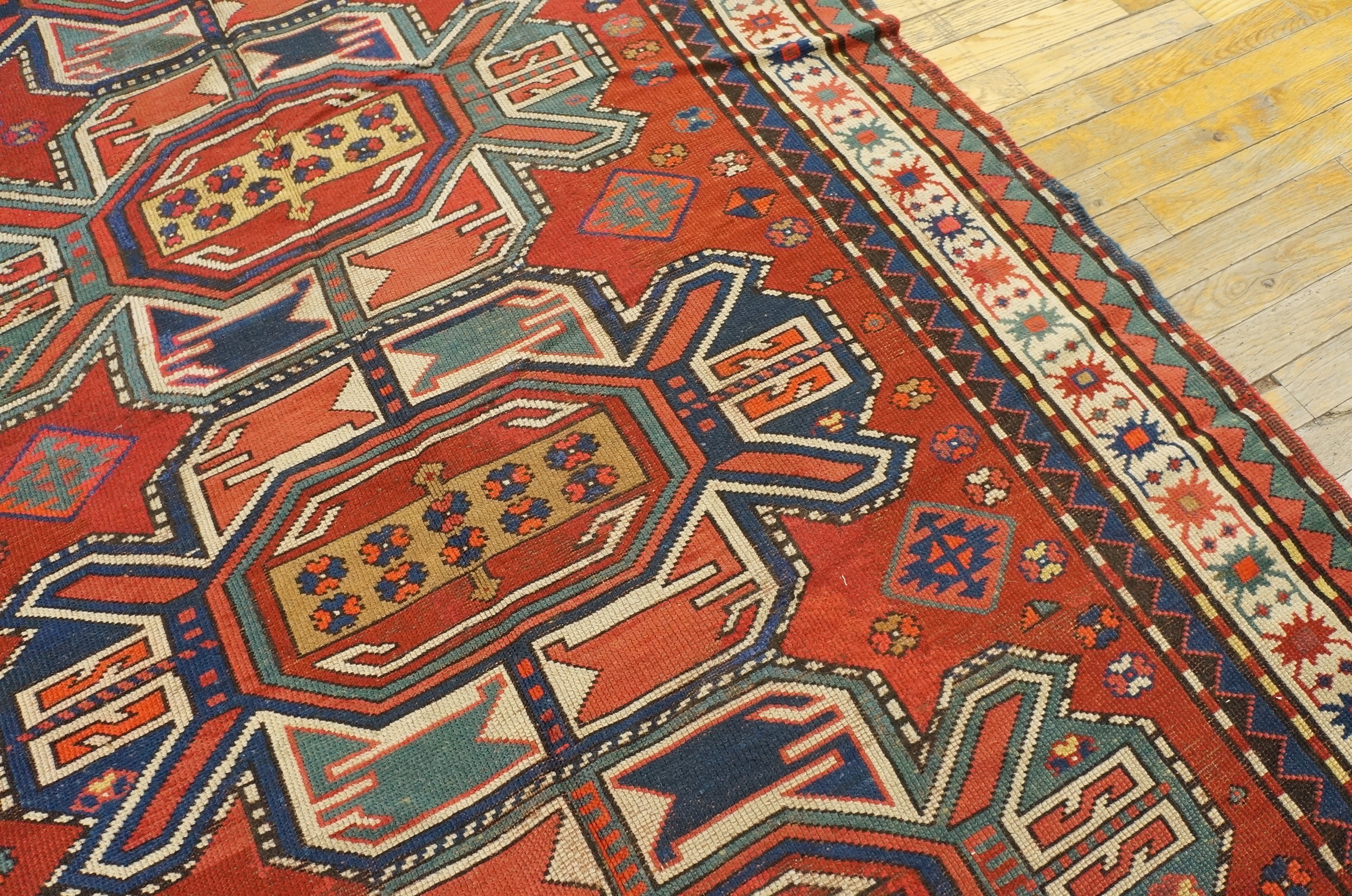 Woven in the Caucasian rugs tradition, this piece showcases the high-quality wool and precise knotting for which the region is renowned. The palette relies on robust, naturalistic tones—deep indigo, rust red, and accents of gold and ivory—which have aged beautifully, retaining their visual intensity despite the passage of time.
