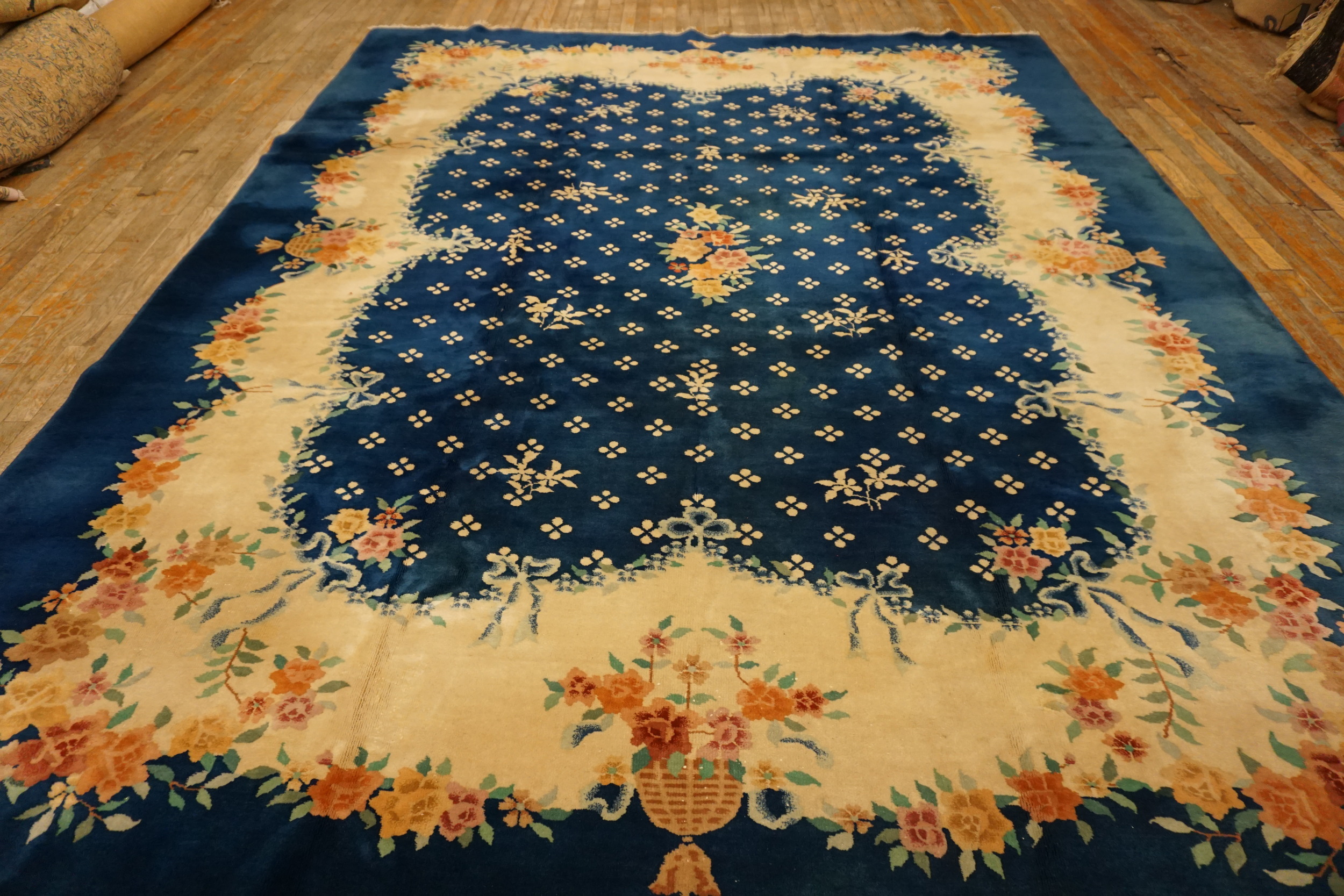 While the border is highly pictorial and detailed, the central field maintains a structured elegance through a repeating, small-scale geometric floral motif. This balanced composition avoids a central medallion, opting instead for an allover rugs structure that allows the eye to travel seamlessly across the deep blue expanse, confirming its status as a masterpiece of 1930s Chinese weaving.
