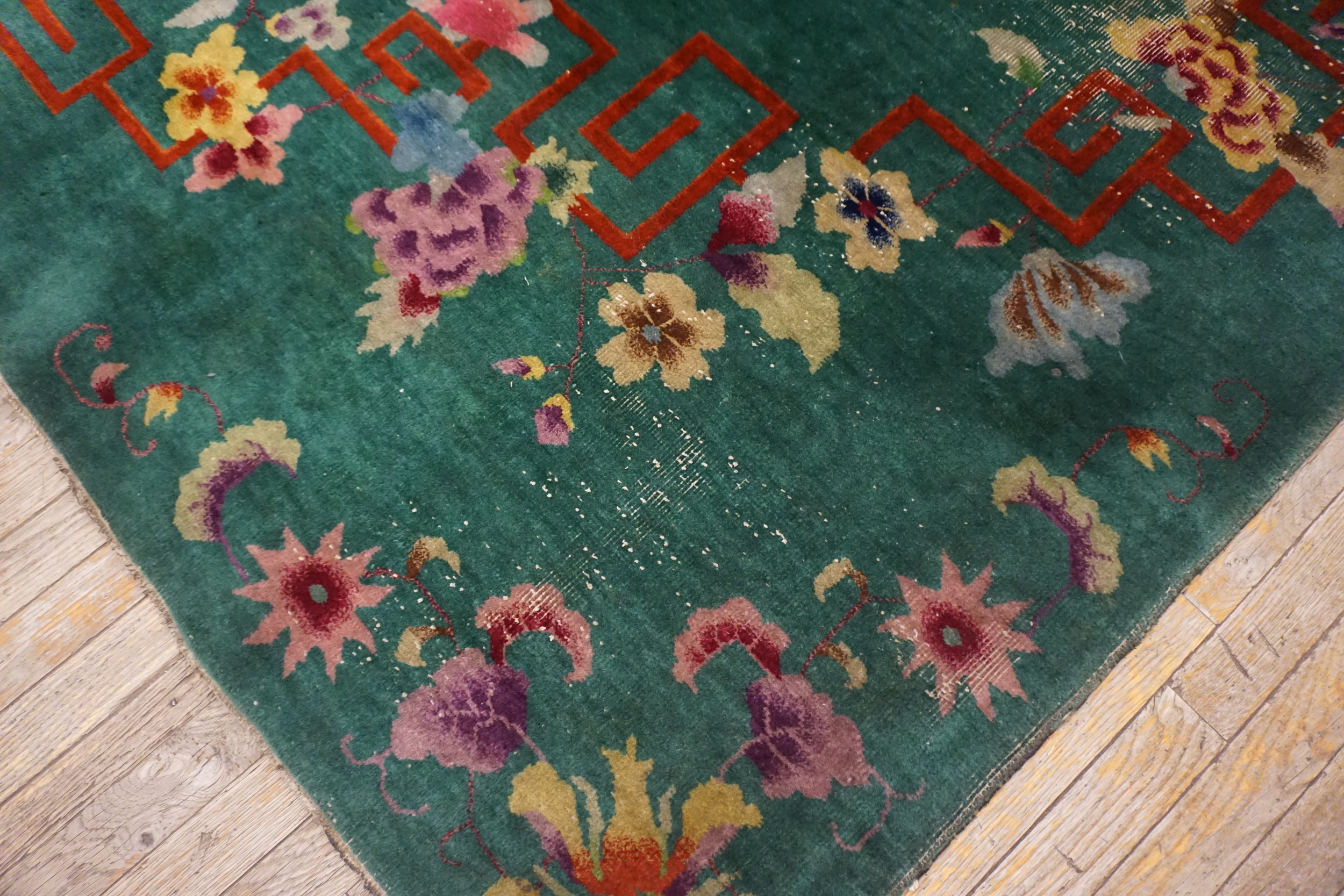 Wool Room Size Chinese – Art Deco Green Antique 1920s Rectangle Knotted Rug, Circa Date: 1920s. This magnificent example of early 20th-century Chinese Art Deco weaving presents a luxurious, deep emerald field. Its substantial dimensions qualify it as a true room size rugs, designed to anchor a sophisticated interior space with both commanding color and impressive scale.