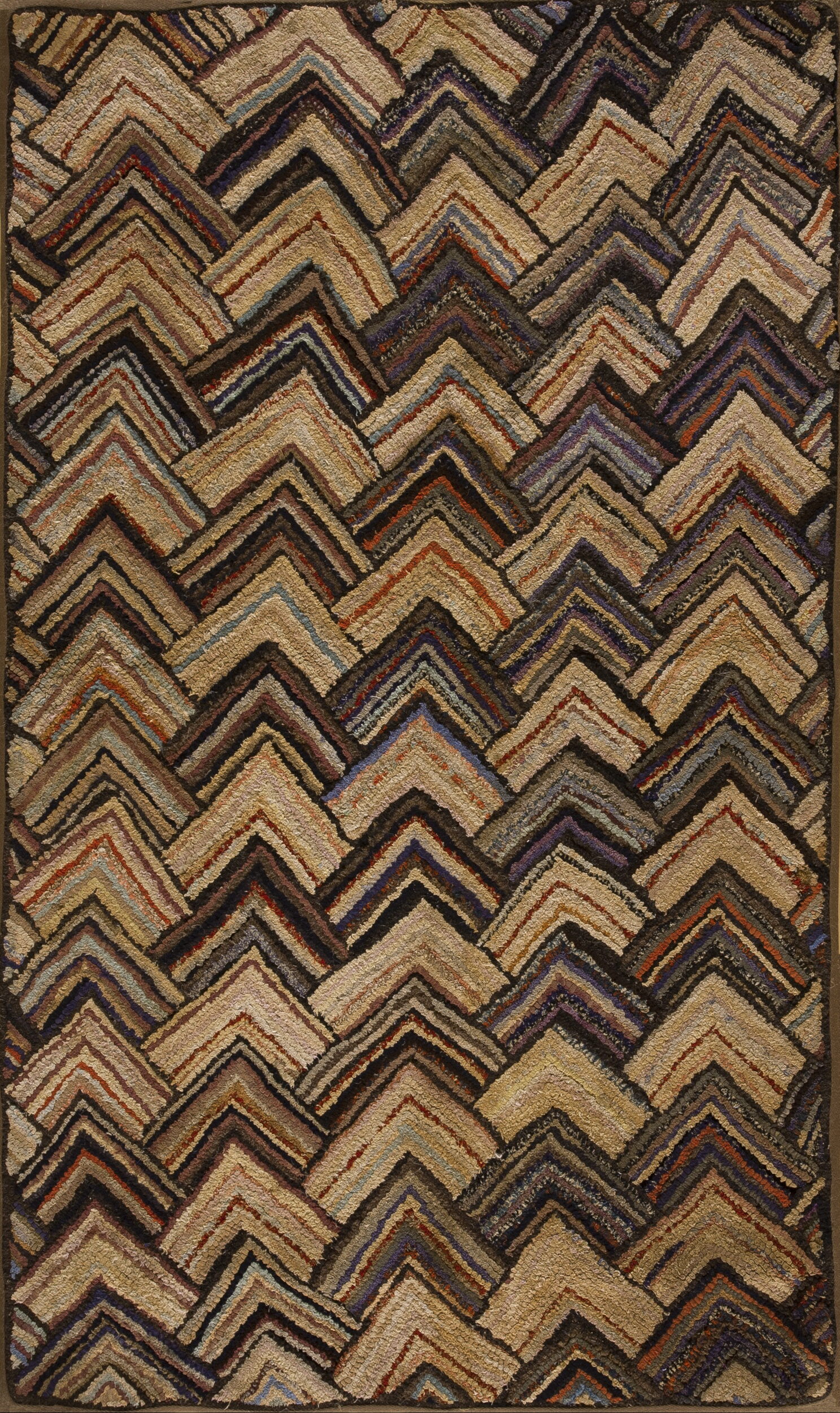 The palette is rich yet subdued, utilizing varied shades of tan, brown, deep purple, and rust, resulting in a complex multicolor jewel tone rugs effect derived from the natural variations of the dyed wool scraps. As a finely preserved example of early 20th-century craftsmanship, this textile is a unique addition to our collection of antique rugs.