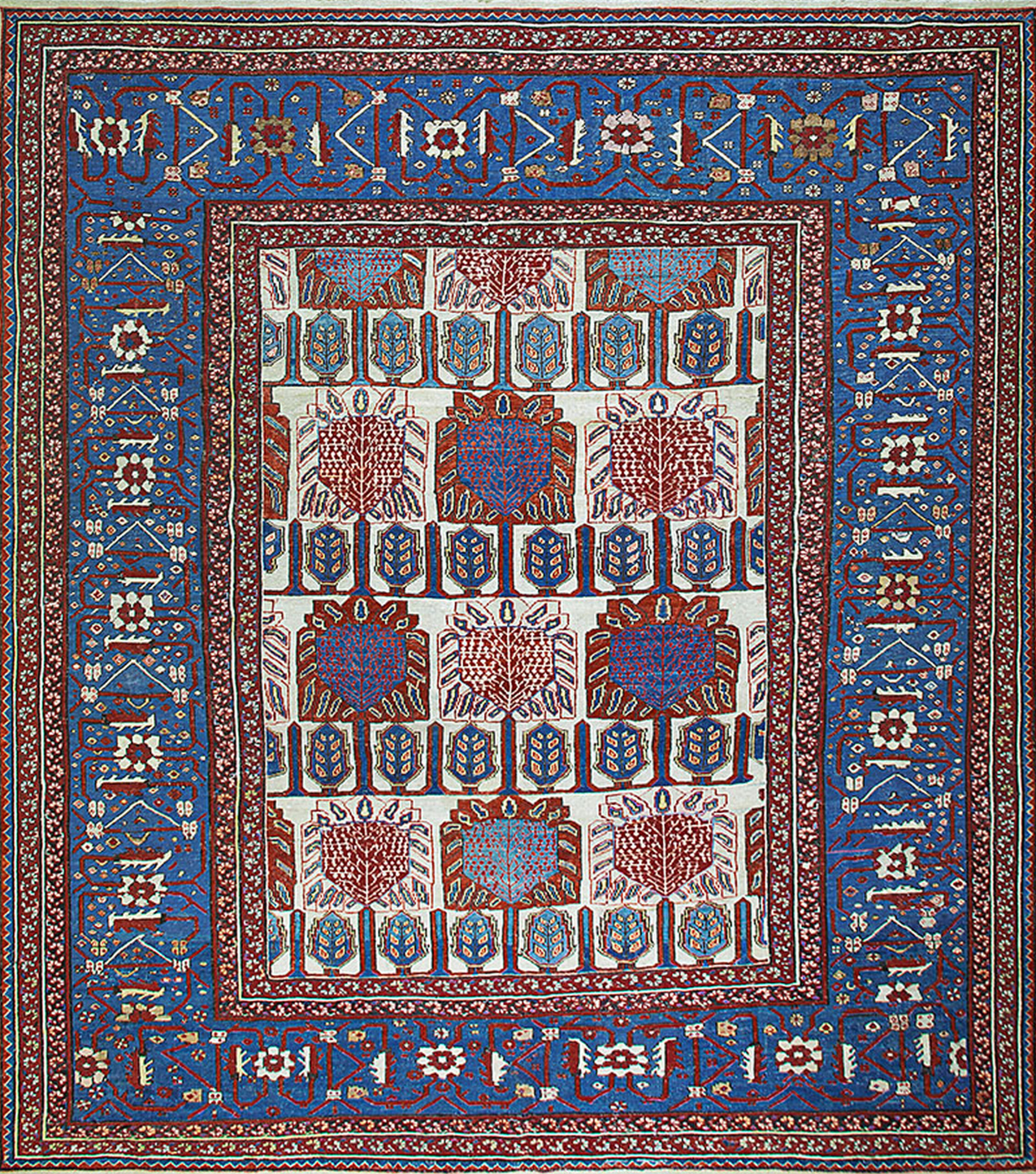 The design employs an impressive allover geometric structure, utilizing repeating stylized medallions and angular motifs rendered in terracotta red and indigo. This highly desirable layout ensures visual balance across the entire surface, allowing the eye to travel smoothly over the intricate, hand-knotted details of the field.