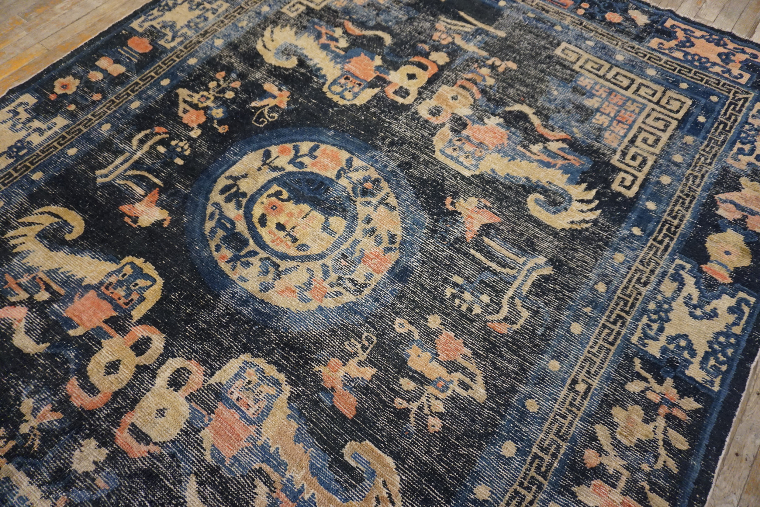 Antique Geometric Medallion Wool Hand Knotted Pile Blue 1850s Rug, Circa Date: 1850s. This exceptional mid-19th-century piece captures the distinctive aesthetic of early Chinese weaving traditions. The composition is defined by a strong central medallion flanked by stylized mythical creatures, all contained within highly structured borders that emphasize the geometric rugs character of the design.