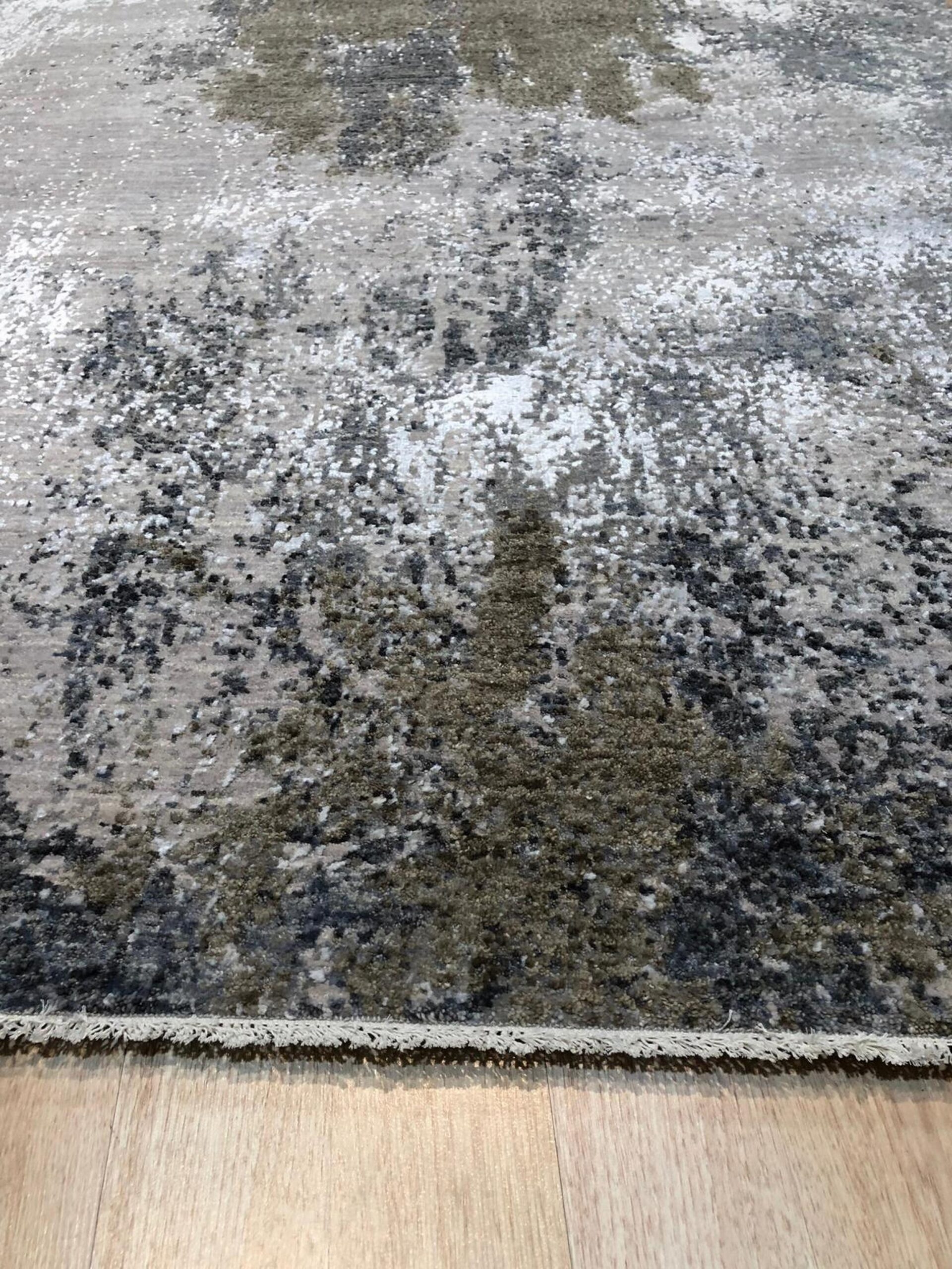 Xena Chloe Gray Hand Knotted Wool Rug. This exceptional piece is a contemporary study in texture and tone, expertly hand-knotted from luxurious wool fibers. Its abstract composition eschews traditional motifs, offering a highly modern aesthetic characterized by layered, distressed visual depth.