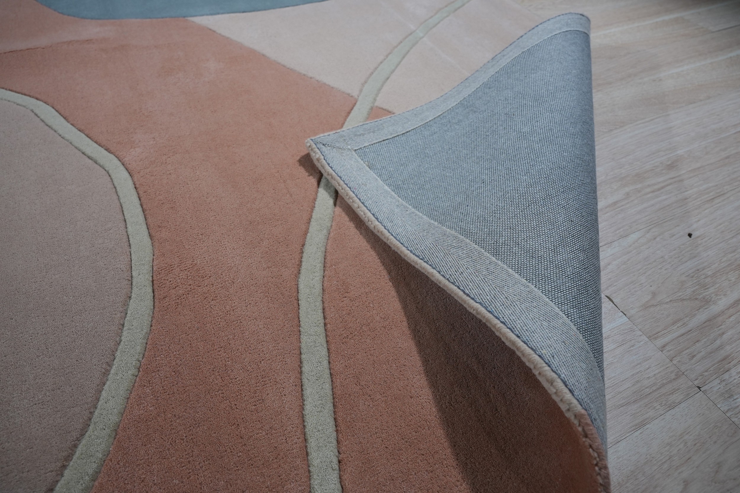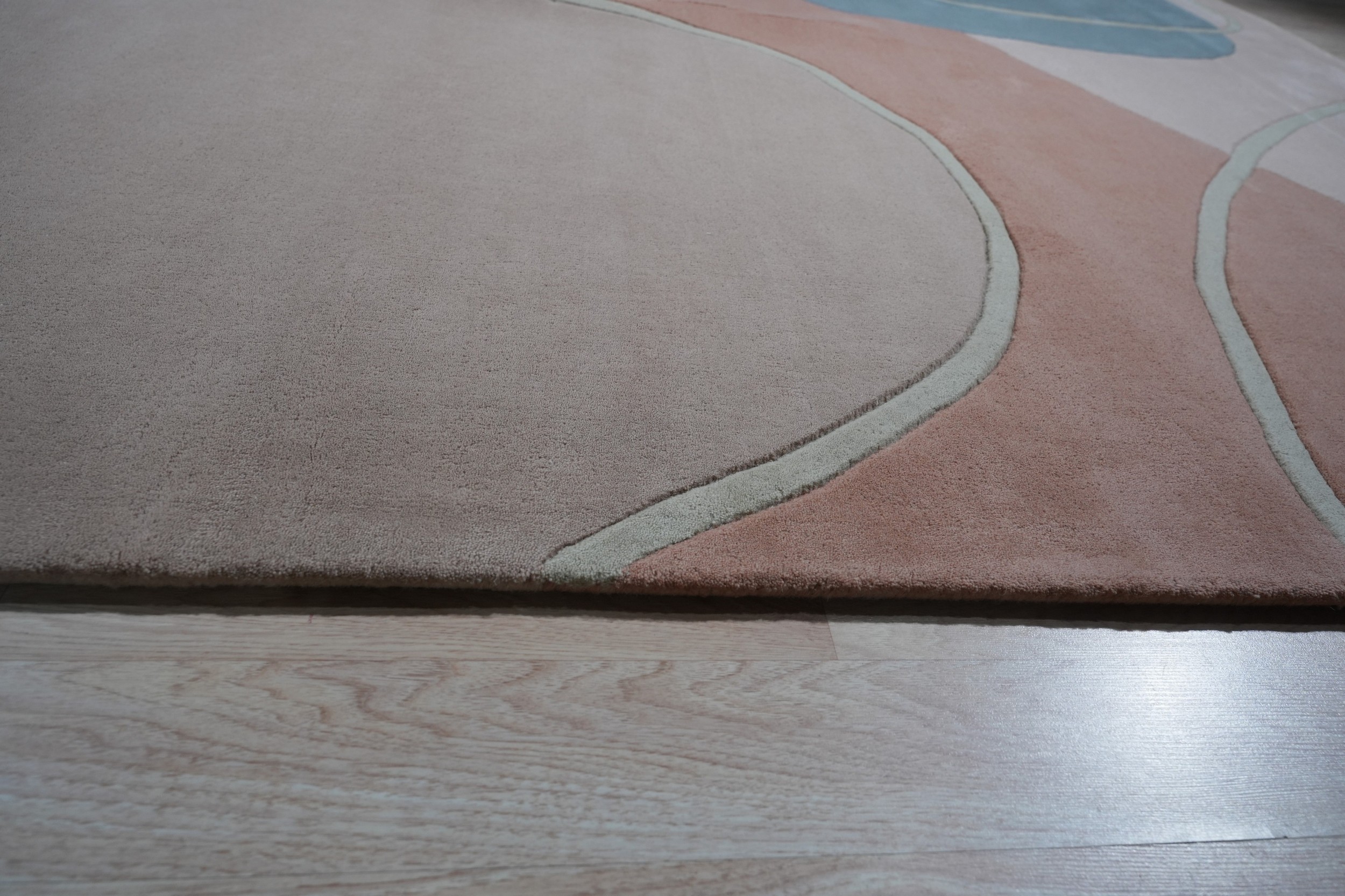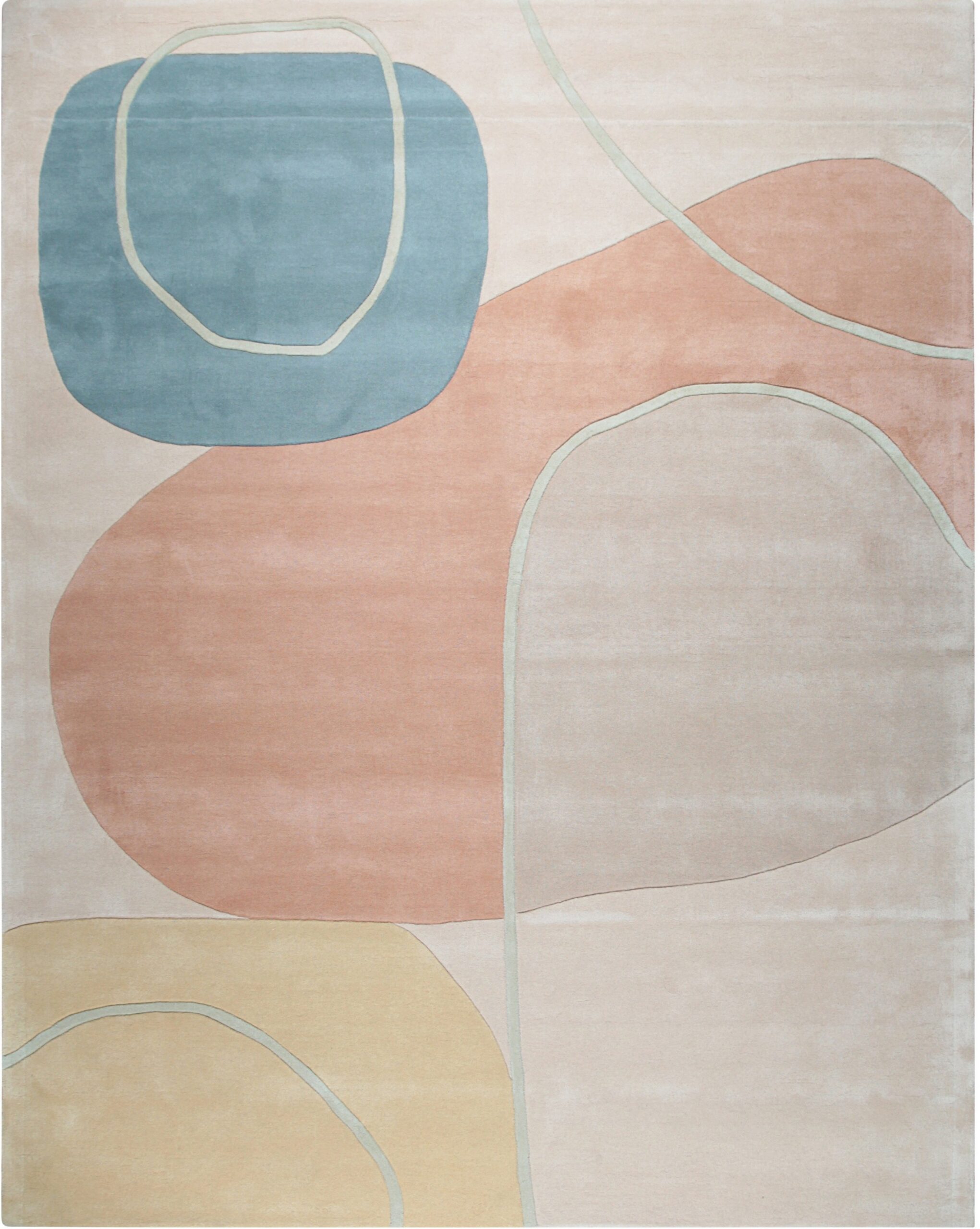 The design is a study in fluid abstraction, featuring large, organic forms that drift across a neutral field. The palette utilizes sophisticated, muted tones—soft blush, pale teal, and warm ochre—creating a harmonious composition. This subtle interplay of shades makes it a compelling example of multicolor jewel tone rugs adapted for the minimalist interior.