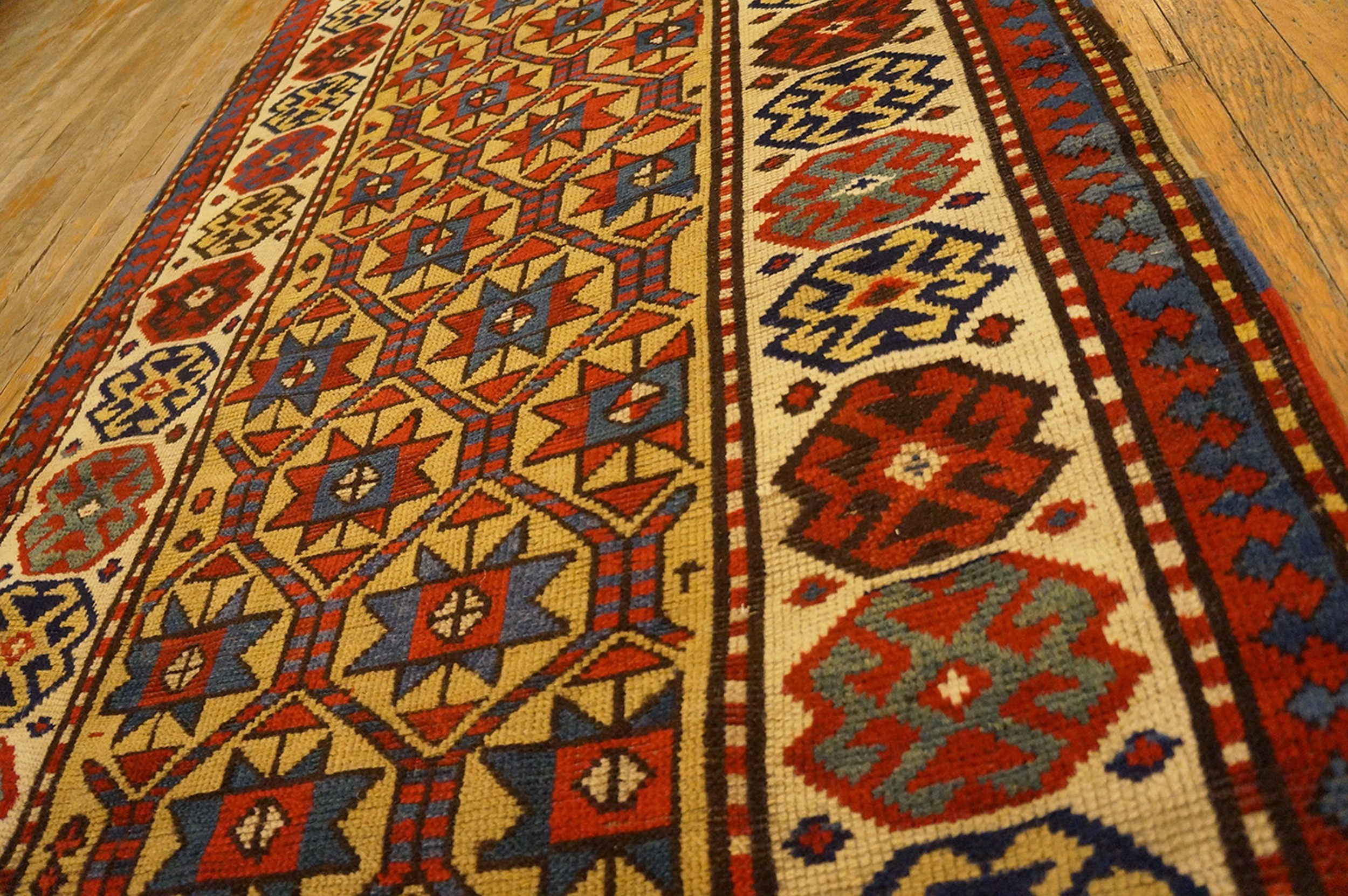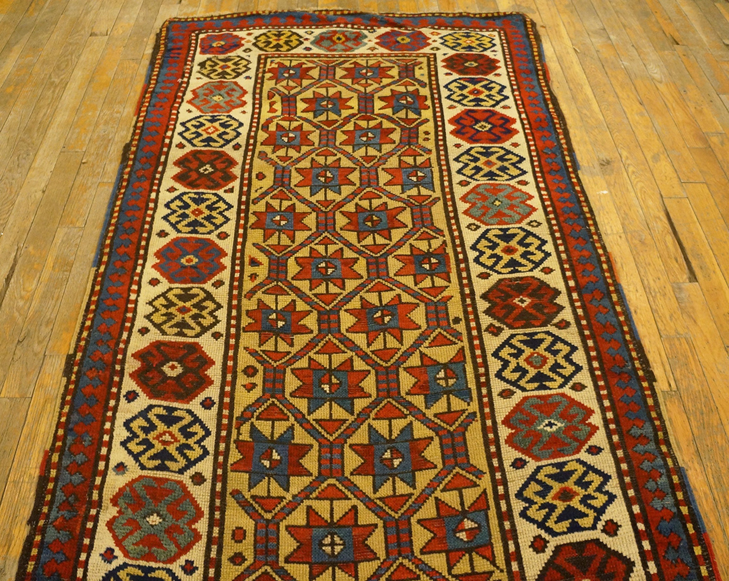 This late nineteenth-century Caucasian Kazak rug / runner is a rare and radiant example of tribal artistry, hailing from the Kazak Steppe—a region nestled between the Talish mountains and the Caspian Sea. While many tribal antique Caucasian rugs favor the deep crimsons and indigos of the “high-altitude” palette, this specific specimen is distinguished by its extraordinary and highly sought-after Saffron, Gold, and Ochre Yellow color story.