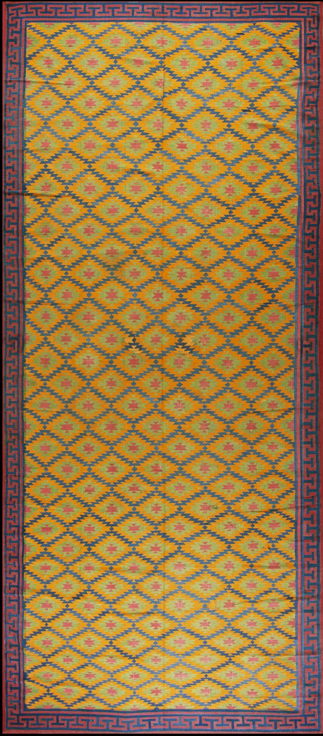 Antique Dhurrie Large Room Size Cotton Yellow Rug, Circa Date: 1935. This striking textile is a superb example of early 20th-century geometric design, utilizing a vibrant palette anchored by a rich, sun-drenched yellow field. As one of our finest antique rugs, its flatweave construction provides a crisp texture, highlighting the bold, repeating stepped diamond motifs that define the composition.