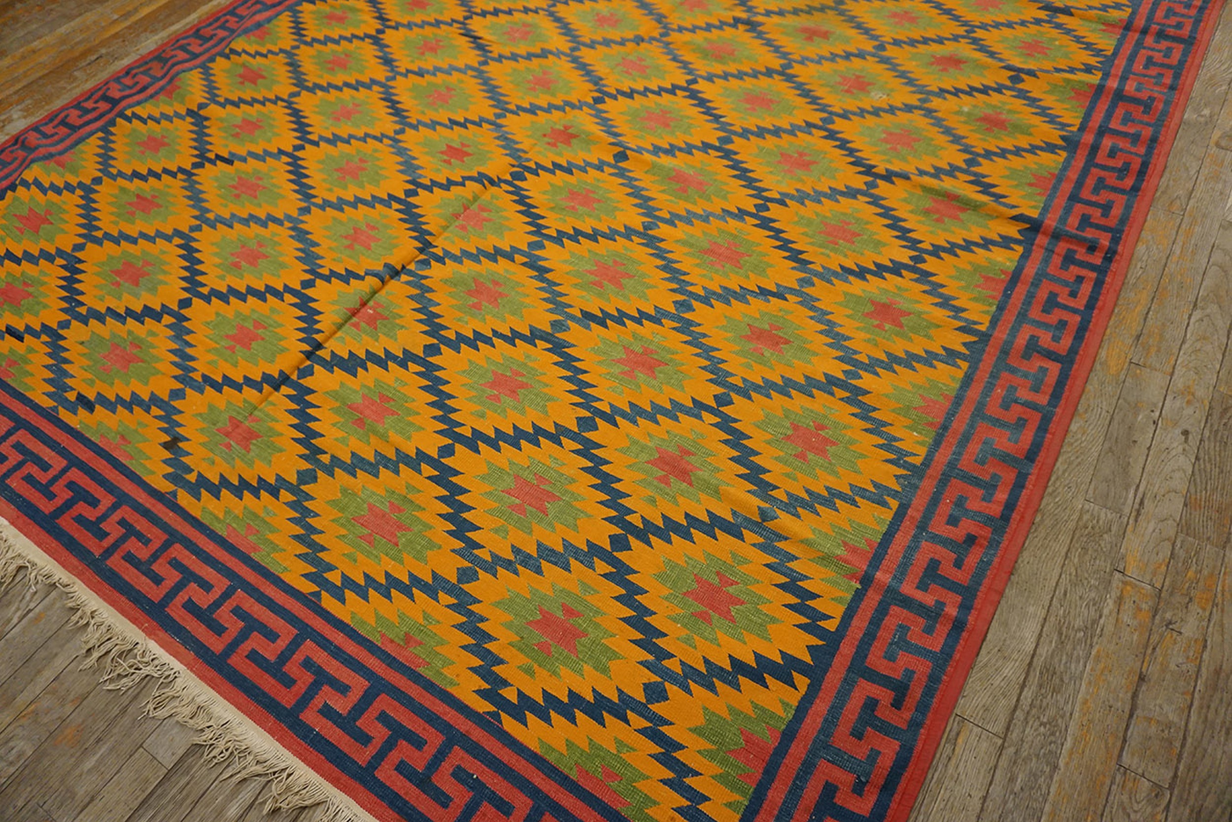 Woven from durable cotton, this Dhurrie rug retains remarkable clarity of color and structure nearly a century after its creation. It offers a powerful aesthetic statement, blending traditional geometric structure with a strikingly modern color sensibility, making it a compelling choice for contemporary or traditional interiors seeking a focal point.