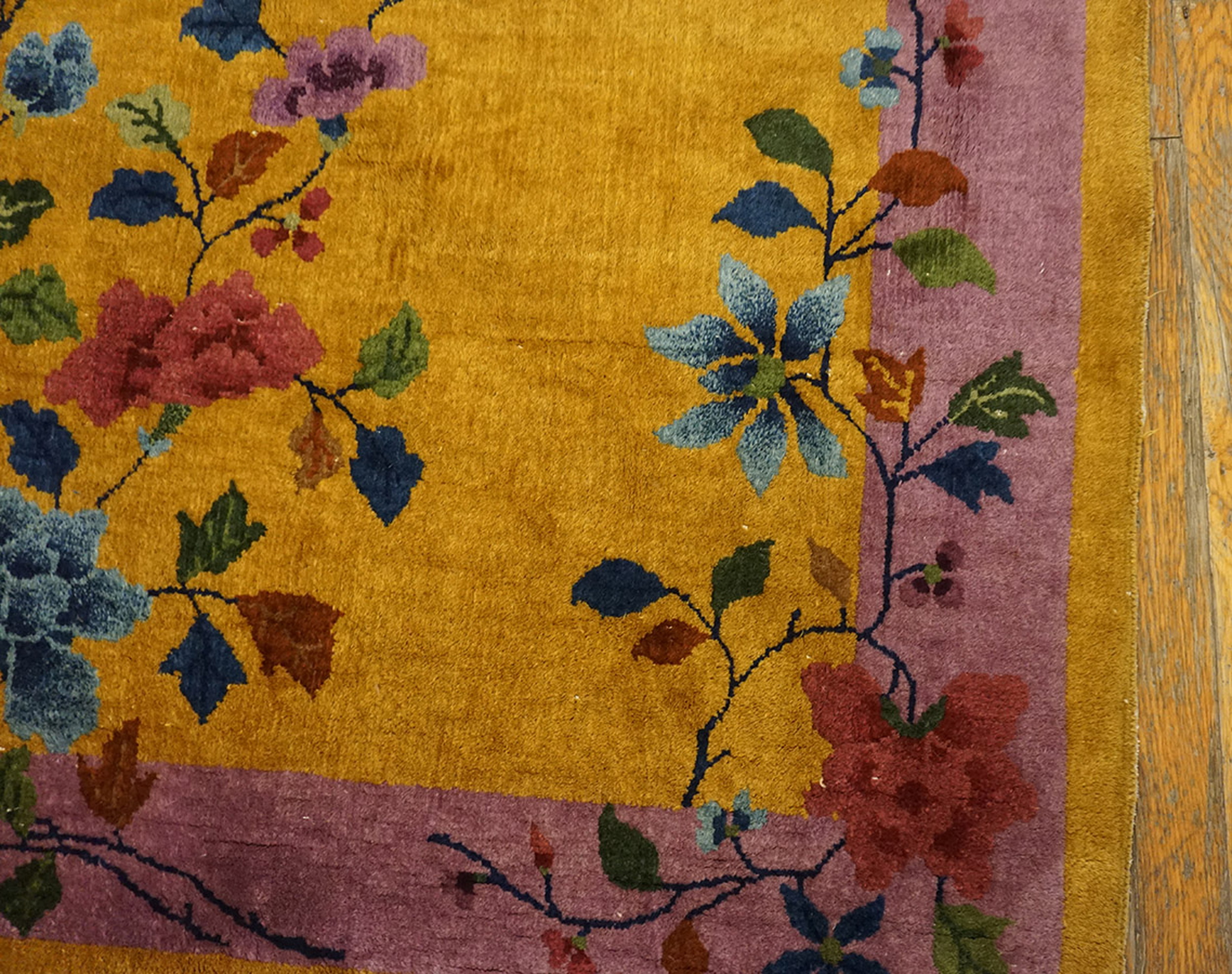 The central field is dominated by a shimmering, deep saffron hue, classifying it among the most striking gold yellow orange color rugs. This brilliant background provides a dramatic contrast to the border’s soft lavender tone. The colors are expertly balanced, allowing the central field to glow without overpowering the delicate vine and blossom motifs.