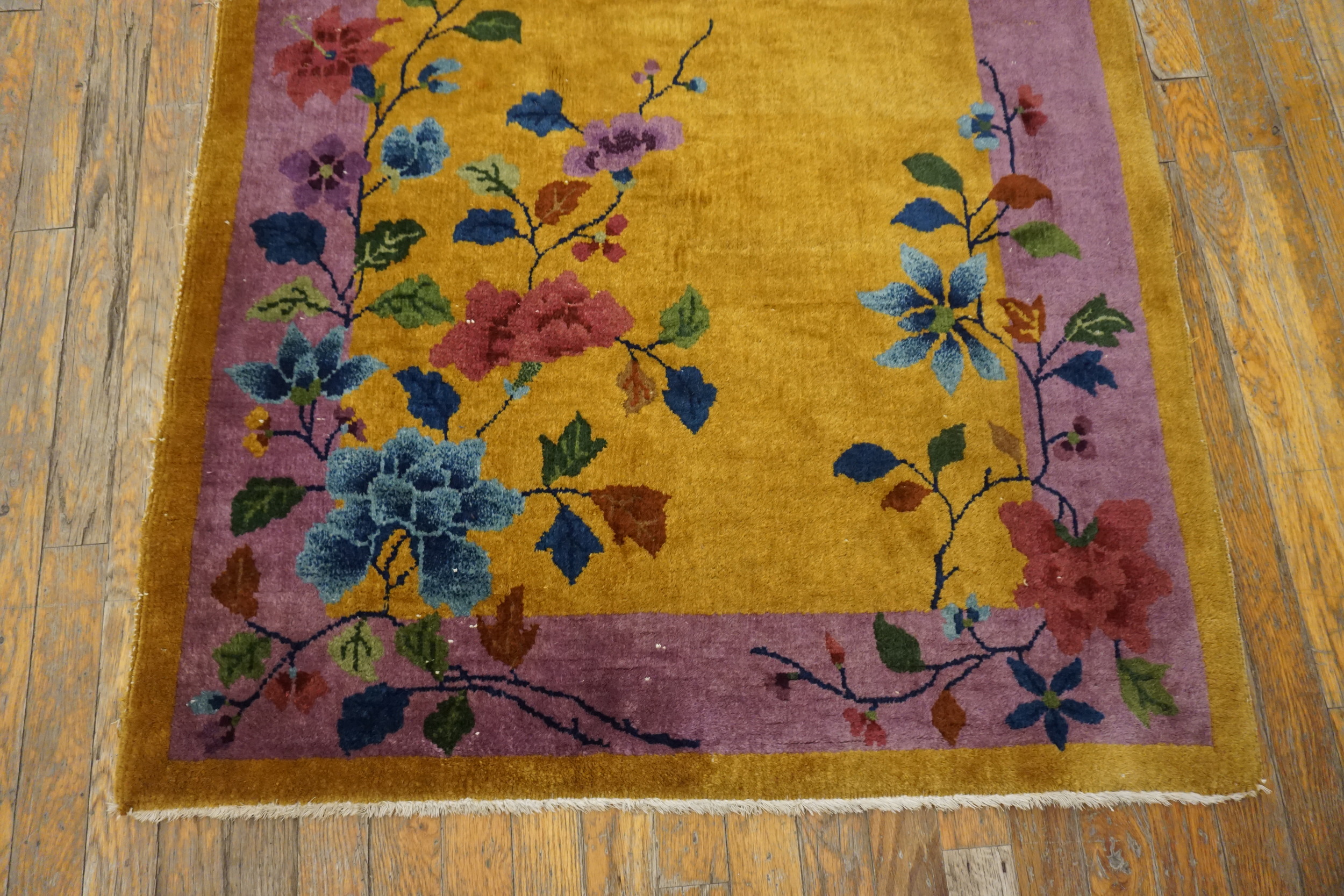 A graceful, meandering vine pattern frames the field, featuring stylized chrysanthemums and peonies rendered in shades of teal, deep mauve, and burgundy. These highly stylized blossoms exemplify the Art Deco interpretation of traditional Chinese floral rugs, where naturalistic elements are pared down to their essential, elegant forms.