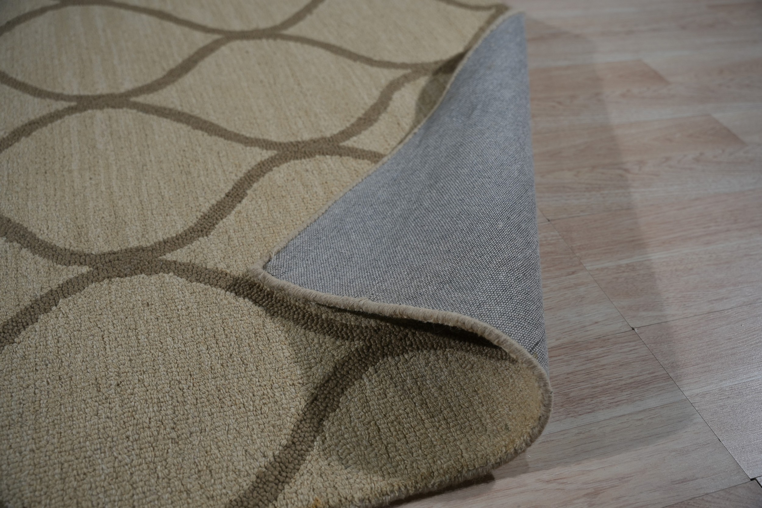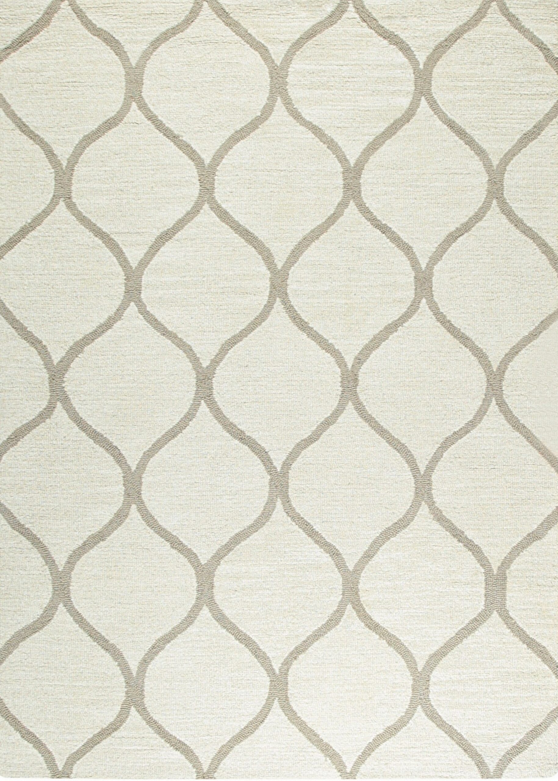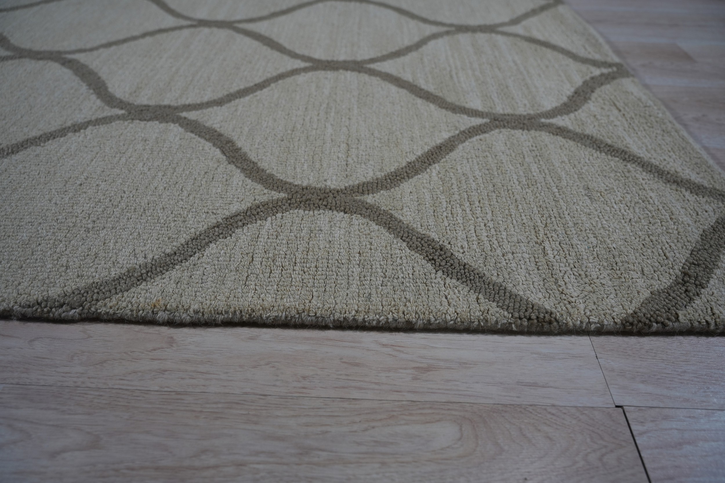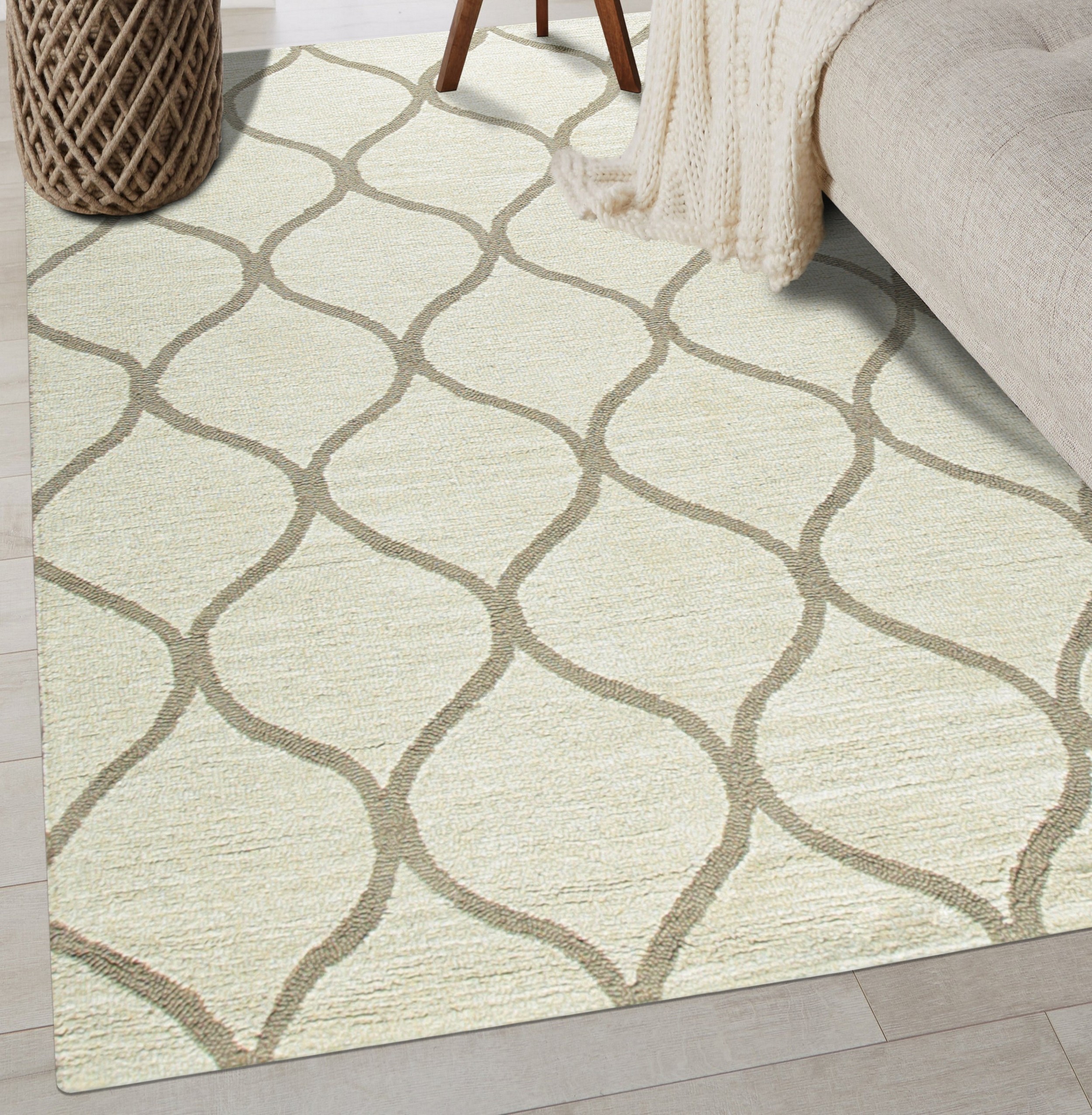 Zinnia Clara Light Gold Hand Tufted Wool Rug. This contemporary piece offers a refined approach to geometric design, featuring a continuous, gently curved trellis pattern set against a creamy, textured ground. The construction utilizes premium wool, providing both durability and a luxurious underfoot feel suitable for modern interiors.