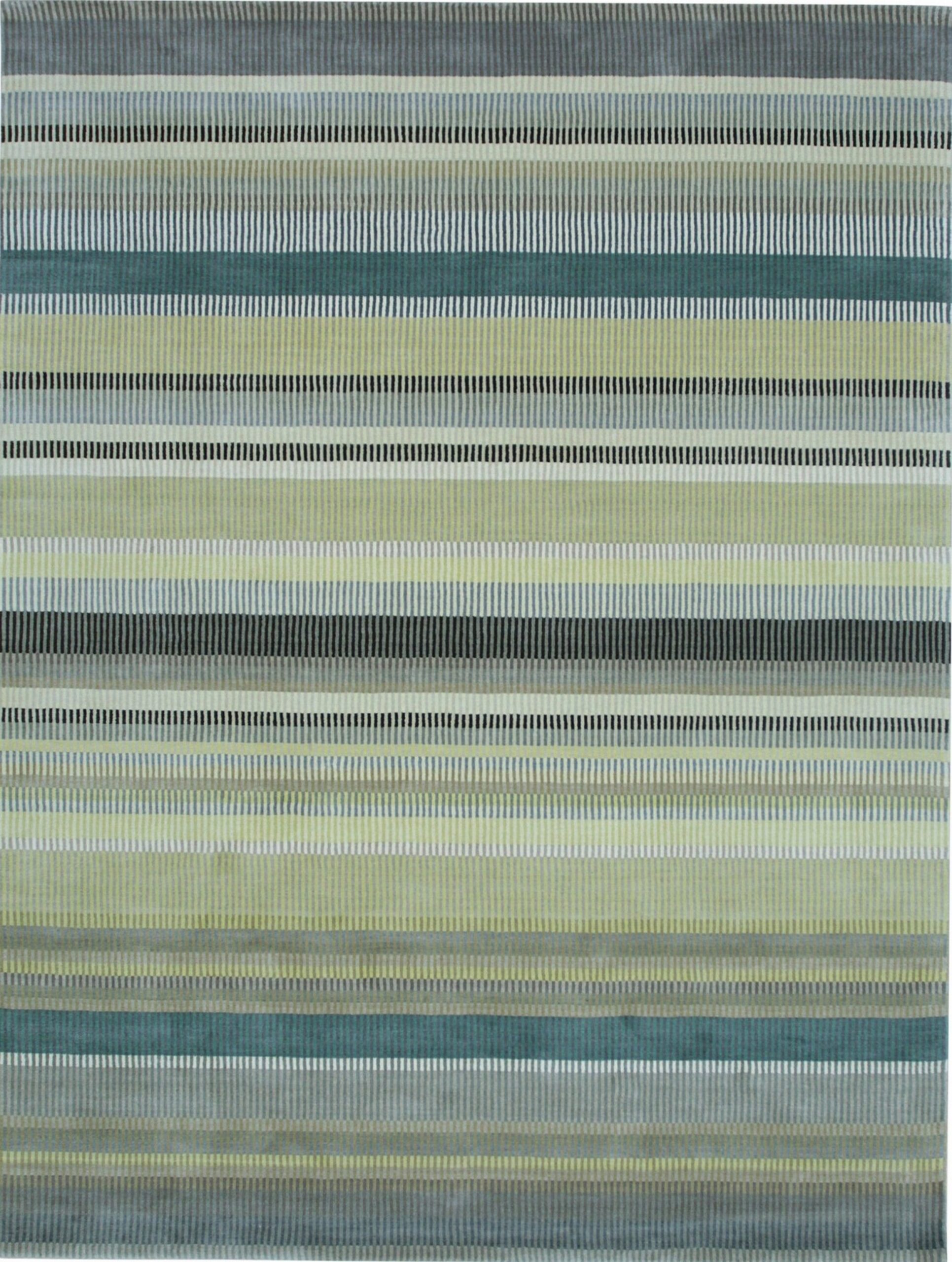 The Zinnia design employs a striking, yet balanced, horizontal stripe motif. Utilizing a complex interplay of variegated tones—from soft chartreuse and pale sage to deep teal and slate grey—the rug achieves a subtle optical vibration. This nuanced palette elevates the category of green color rugs beyond the conventional, offering depth and versatility.
